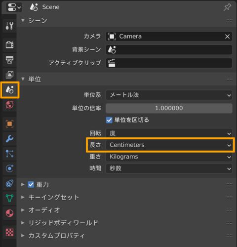 お題通り、単位を設定する方法 シーンプロパティ > 単位 > 長さ デフォルトだとメートルになっている。 変更すると、3Dビューの表示も変わってる! 以上
